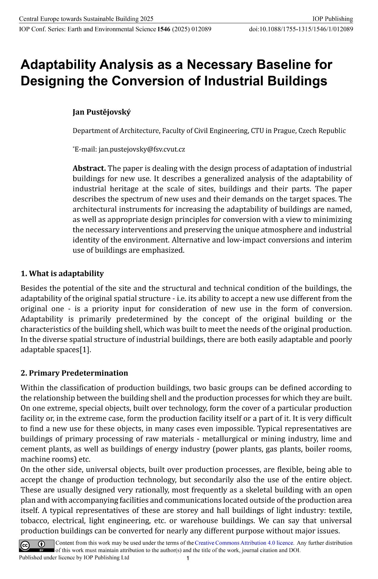 PŘÍSPĚVEK ADAPTABILITY ANALYSIS AS A NECESSARY BASELINE FOR DESIGNING THE CONVERSION OF INDUSTRIAL BUILDINGS (AJ)